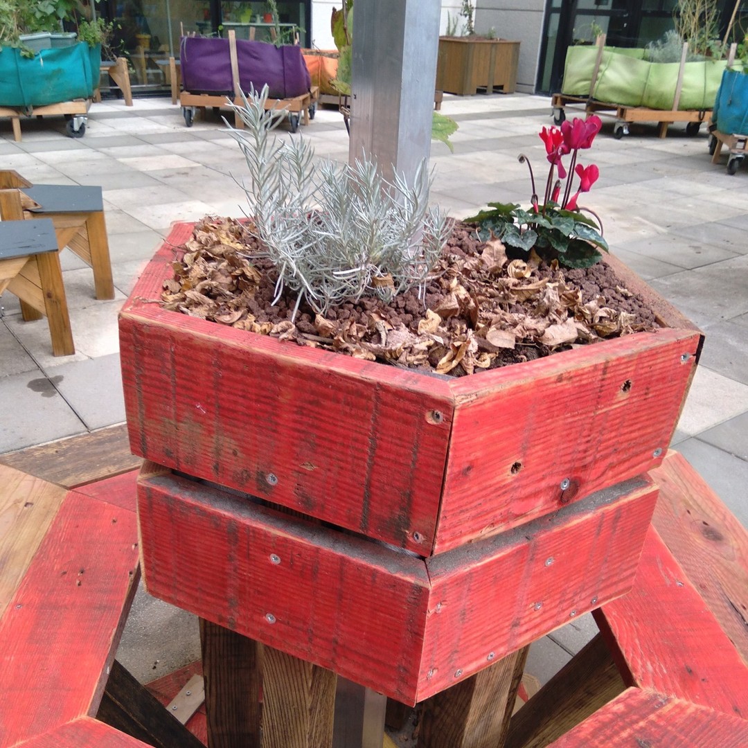 Retrouvez nos créations au sein du Patio : maxi-sacs de culture hors sol, jardibanc, banc hexagonal et sa table au plateau en mosaïque recyclée…