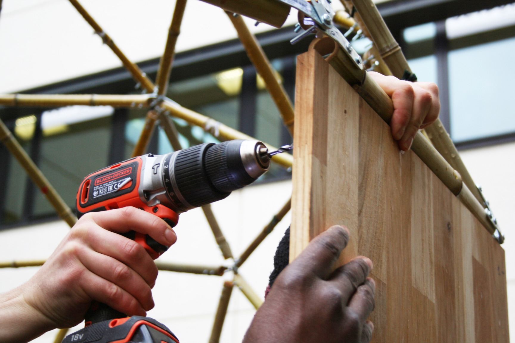 Afin de promouvoir son activité Gaz vert, GRDF a passé commande à la Manufacturette d’une structure modulaire évoquant un méthaniseur. Elle a été réalisée à partir de panneaux de chêne FSC, de bambous et de tissu labellisé Oeko-tex pour le revêtement extérieur.